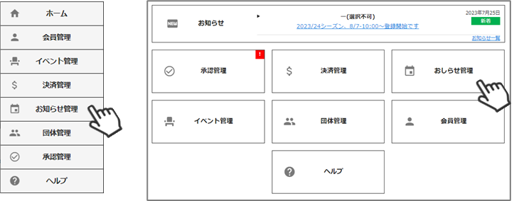 ①メインメニュー(or 左側メニューバー)の「お知らせ管理」をクリックしてください。