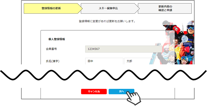 ⑥スキー保険の加入画面が表示されます。ご希望する保険を選択し、「次へ」をクリックしてください。※2022/23シーズンより、会員登録申請時以外にも保険のお申込が可能となりました。