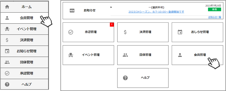 ①メインメニュー(or 左側メニューバー)の「会員管理」をクリックしてください。