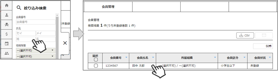 ②左側検索キーを使用し、会員を検索後、ヒットした会員をクリックしてください。