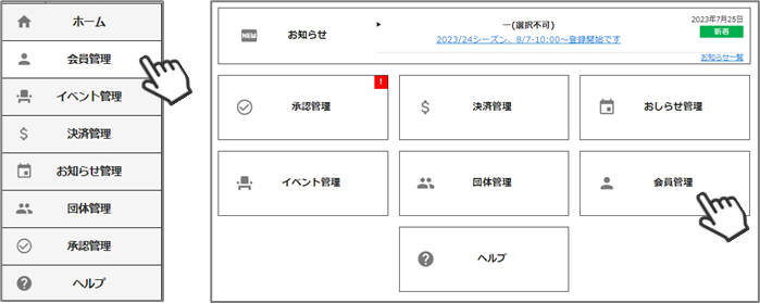 ①メインメニュー(or 左側メニューバー)の「会員管理」をクリックしてください。