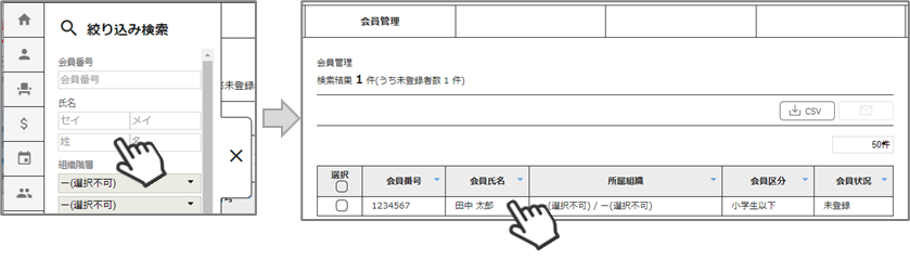 ②クラブ所属会員が表示されます。左側検索キーを使用し、当該会員の検索を行い、ヒットした会員をクリックしてください。