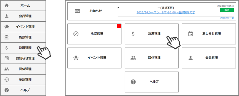 ①メインメニュー(or 左側メニューバー)の「決済管理」をクリックしてください。