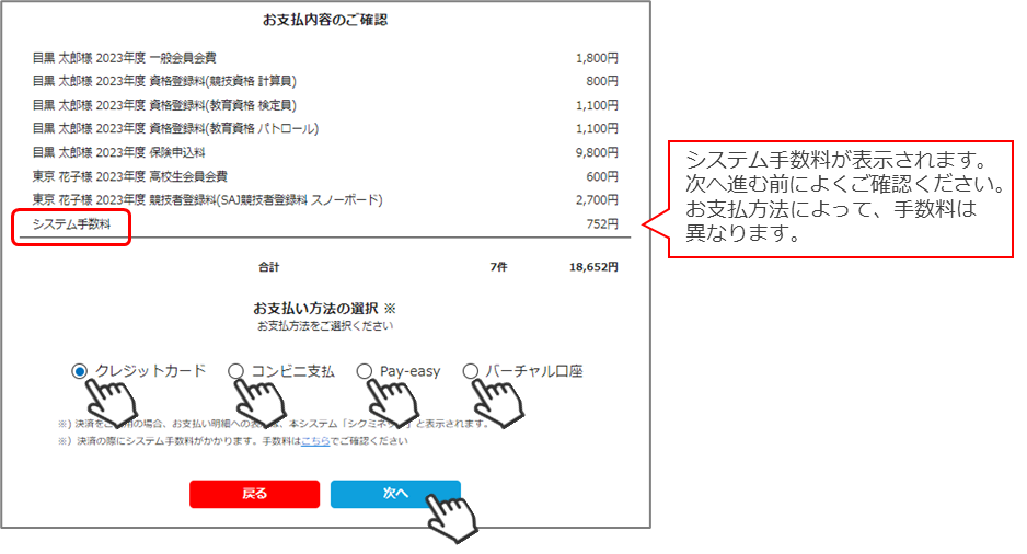 ③決済額が表示されるため、内容を確認し、決済方法を選択して「次へ」をクリックしてください。