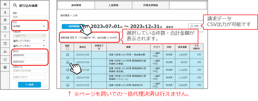 ②左側検索キーを使用し、画面上段の決済区分プルダウンにて「未決済」を選択してください。未決済の明細が表示されます。代理で支払う明細を選択し、「一括代理決済」をクリックしてください。