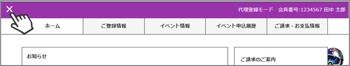 ⑨申し込みが完了したら、左上の「✖」をクリックし「代理登録」を解除してください。