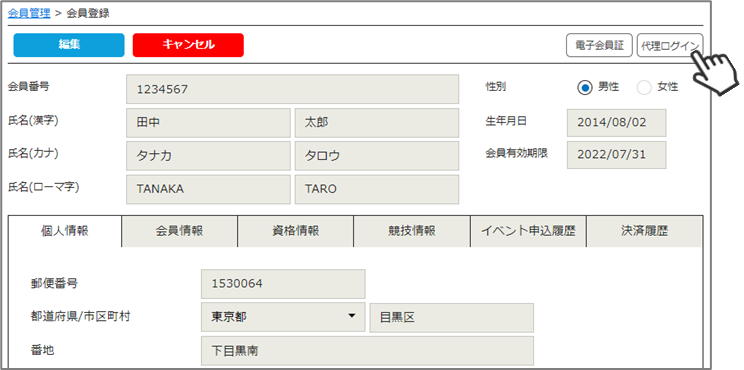 ③会員の登録情報が表示されます。右上の「代理ログイン」をクリックしてください。