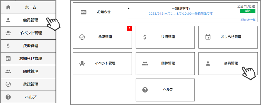 ①メインメニュー(or 左側メニューバー)の「会員管理」をクリックしてください。