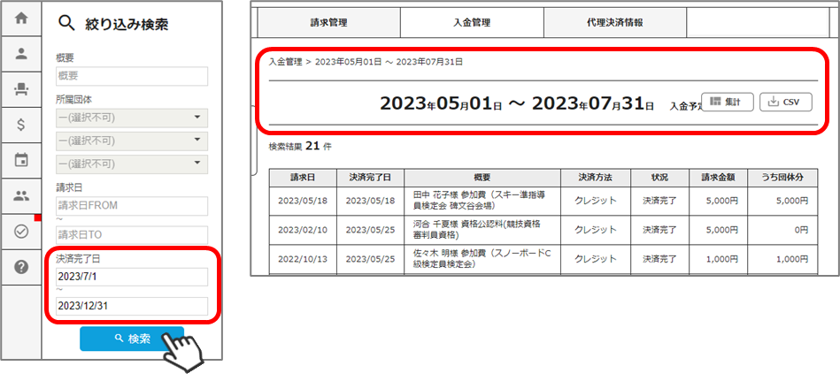 ※複数月またいだ表示・集計が可能となりました。絞り込み検索「決済完了日」を指定してください。