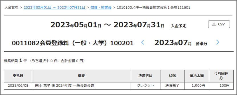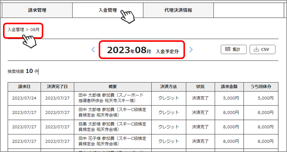 ②画面上段のタブ内「入金管理」をクリックしてください。決済完了済の明細と、何月に団体の口座に入金予定かの確認ができます。