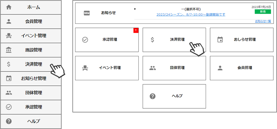 ①メインメニュー(or 左側メニューバー)の「決済管理」をクリックしてください。