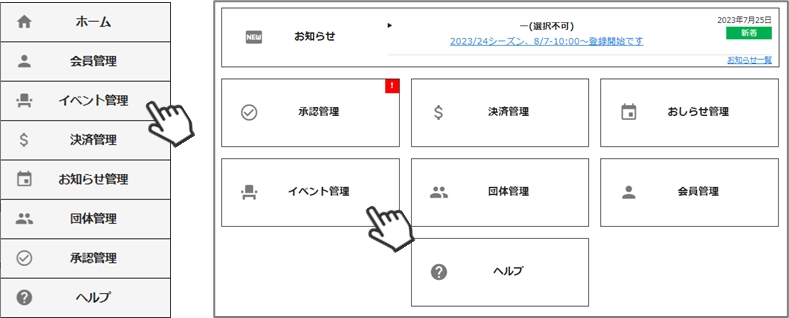 ①メインメニュー(or 左側メニューバー)の「イベント管理」をクリックしてください。