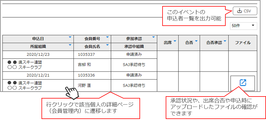 本機能は、全国すべてのイベントから「配下の会員の申し込みが1名以上あるイベント」が表示され、申込者を確認することができます。