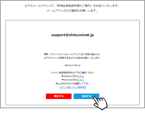 ※送信をクリックしてもメールが届かない場合、「@shikuminet.jp」からのメールを受け取れるよう、ドメイン指定受信設定を行い、再度お試しください。