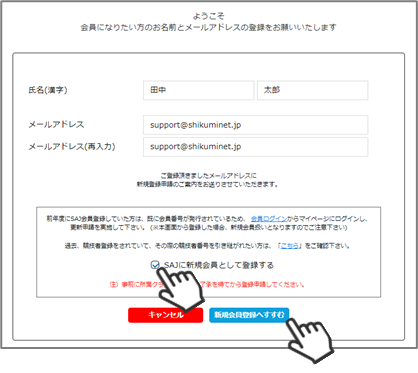 ②名前とメールアドレスを入力して、「SAJに新規会員として登録する」の□に✔を入れ、「新規会員登録へすすむ」をクリックしてください。