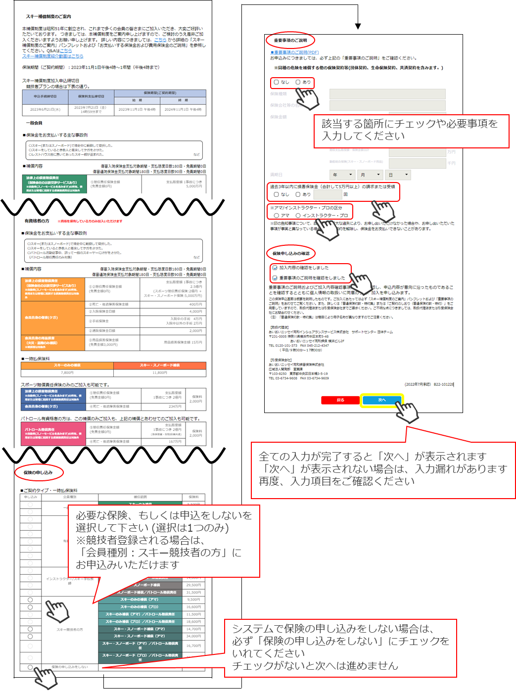 ⑤スキー保険の加入画面が表示されます。ご希望の保険をお選びください。一般会員・有資格者・インストラクターおよびスキー学校教師・スキー競技者に分かれています。パトロール有資格者は「パトロール賠償責任」補償に、あわせてご加入いただけます。