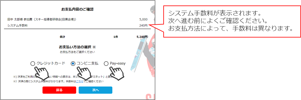 ⑦決済額が表示されます。内容を確認後、決済方法を選択し、「次へ」をクリックしてください。